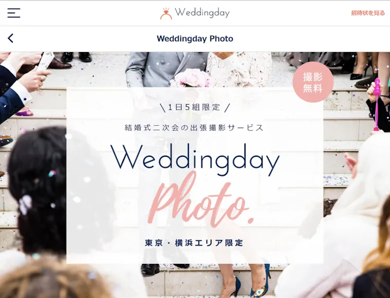 弊社は、結婚式や二次会のWeb招待状を無料で作成できるサービス「Weddingday」を運営しています。「Weddingday」は完全無料でご利用いただけるサービスですが、会員様向けに結婚式2次会の出張写真撮影サービス「Weddingday Photo」を提供しております。