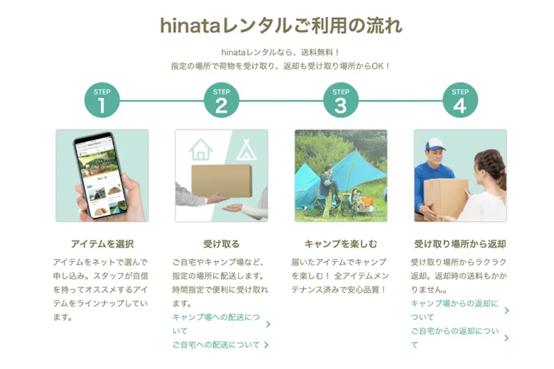 初心者でも安心、ブランドキャンプ用品のレンタルサイト【hinata レンタル】を行っています。「最高のキャンプ体験をレンタル」をテーマにしており、全てのアイテムが送料無料かつ、キャンプ場での受け取り返却が可能なので、手ぶらで充実したキャンプが楽しめます。