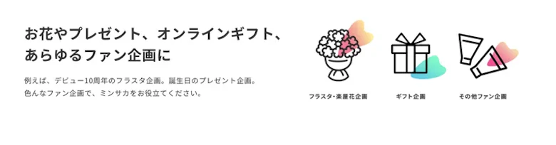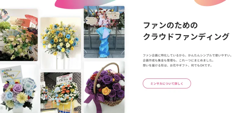 コンサートやイベント会場などでよくフラスタを見かけますよね。フラスタ企画や、誕生日のプレゼントを企画するにしてもどこで募集すればいいか?参加者への連絡をどうすればいいのか?など管理が大変です。「minsaka(ミンサカ)」を利用すれば募集から集金、管理まですべてが完結します。ぜひ活用してみてください!