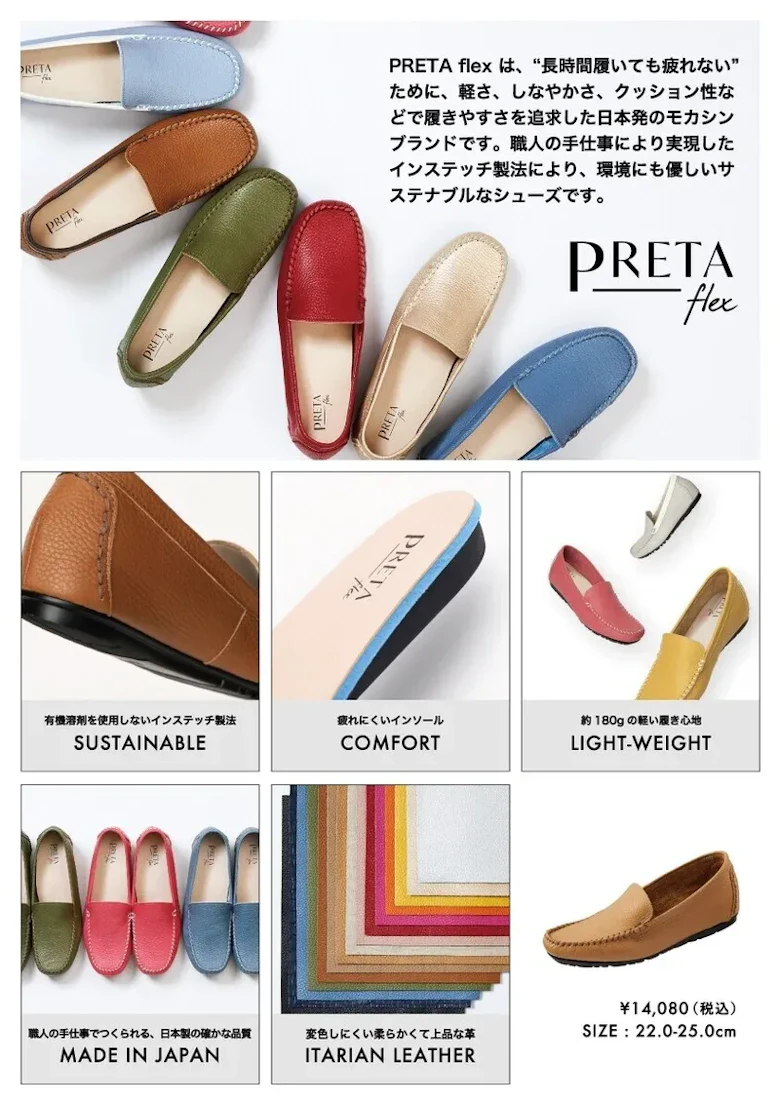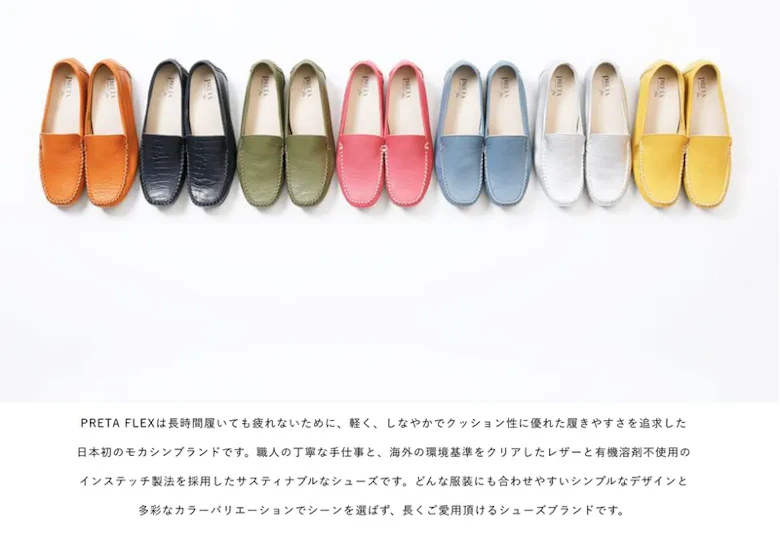 弊社では、長年培ってきた靴づくりの技術を生かし、履き心地にこだわった日本製のモカシンシューズをD2Cで消費者の方にご提供しております。「PRETA flex(プレタフレックス)」は豊富なサイズとカラーバリエーション、有機溶剤不使用で環境にも配慮しております。イタリア製と日本製の本革を使用したソフトで足あたりの良い婦人靴です。