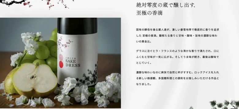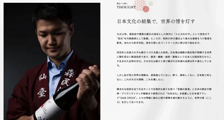 ハレの日を誘う、圧倒的な香りを追求した日本酒ブランドSAKEDRESSです。大正13年に創業し、昭和53年に発生した宮城県沖地震で蔵が倒壊し一度幕を下しましたが、令和3年に再起しました。日本酒は世界でも類を見ない類まれな技術で、その全てを引出したのが我々のブランドです。終了済みのクラウドファンディングでは330万を調達し女性のお客様から多く反響を頂いております。非日常の食卓や記念日を彩るに相応しいSAKEDRESSをおたのしみください。