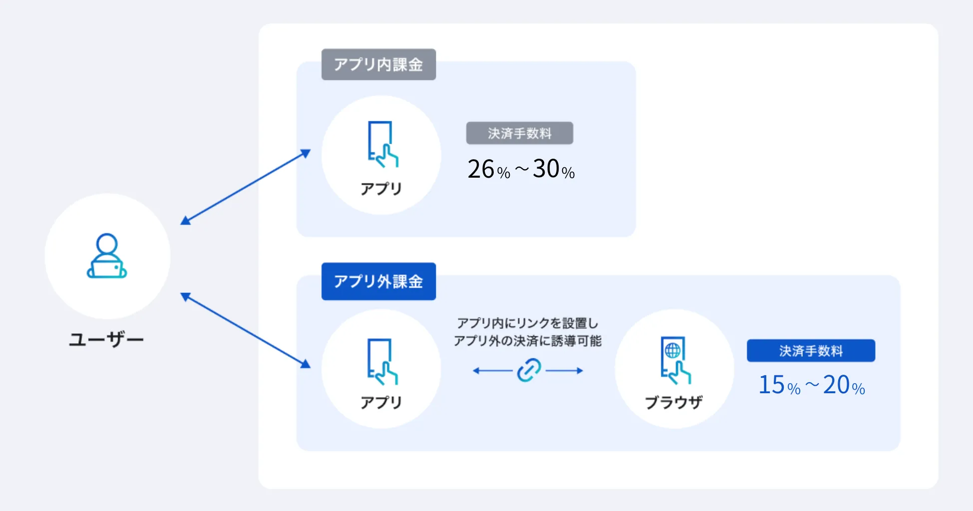 アプリ外課金(外部リンク誘導)とは、アプリ内で利用するデジタルコンテンツやサービスの料金を支払う際、AppleやGoogleの決済システムを通さずに、外部のWebブラウザなどに遷移して決済を行う仕組みのことです。