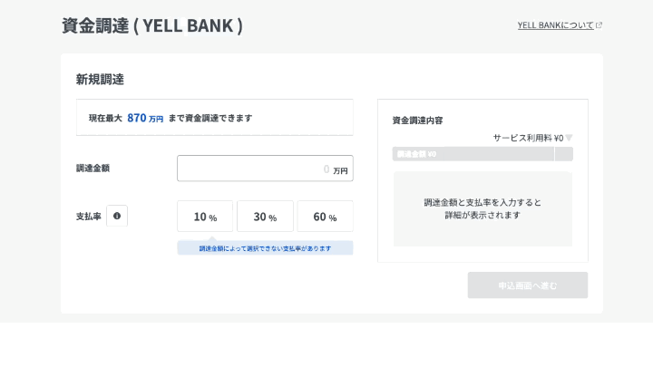 PAY.JP の管理画面にある「資金調達(YELL BANK)」ページにて、調達金額と支払率の選択ができます。