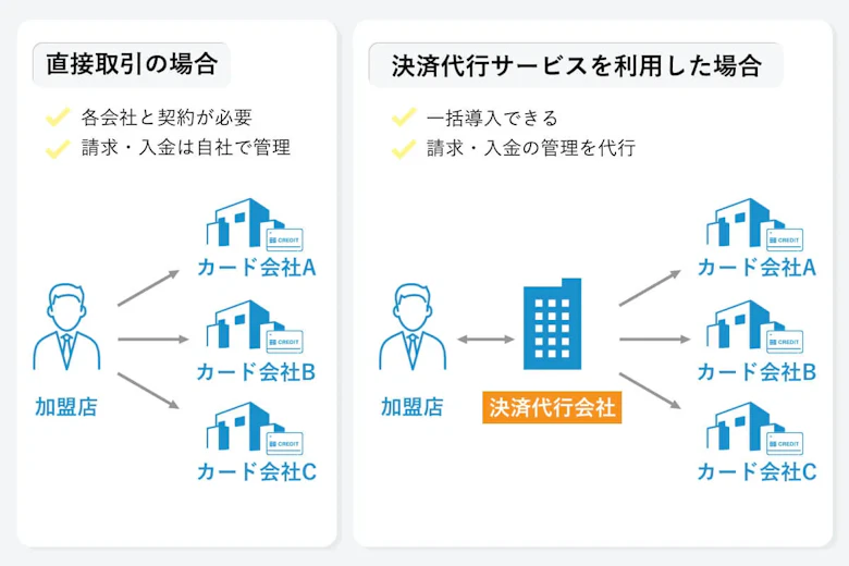 決済代行会社は、各カード会社との接続を担い、請求入金の管理を代行することで、決済システムを導入したい事業会社の初期投資費用やインフラ運用コストを大幅に削減することができるサービスです。